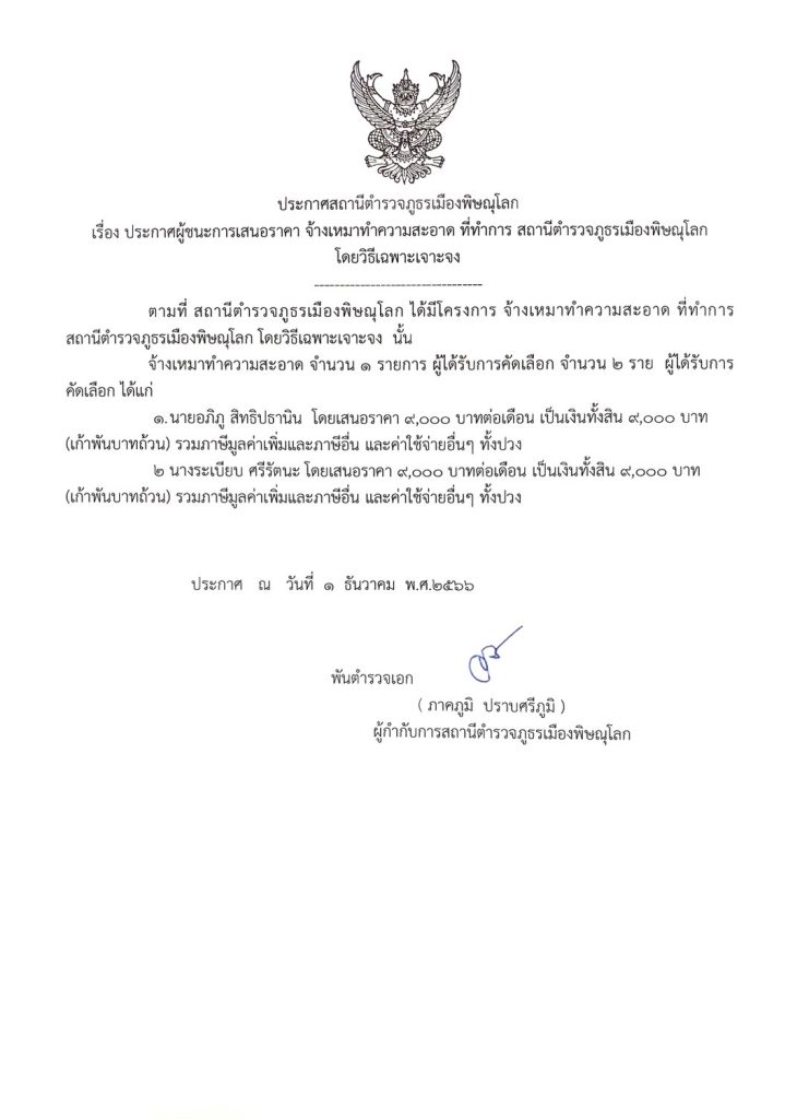 ประกาศจัดซื้อจัดจ้าง จ้างเหมาทำความสะอาดที่ทำการสถานีตำรวจภูธรเมืองพิษณุโลก