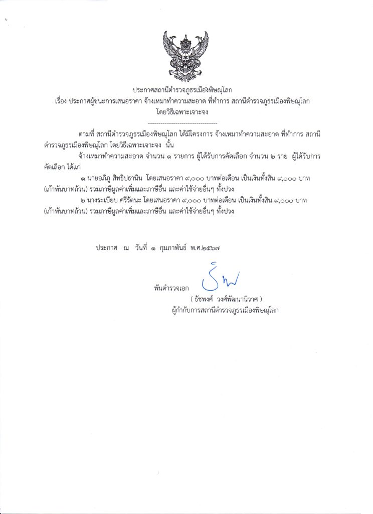 ประกาศจัดซื้อจัดจ้าง จ้างเหมาทำความสะอาดที่ทำการสถานีตำรวจภูธรเมืองพิษณุโลก
