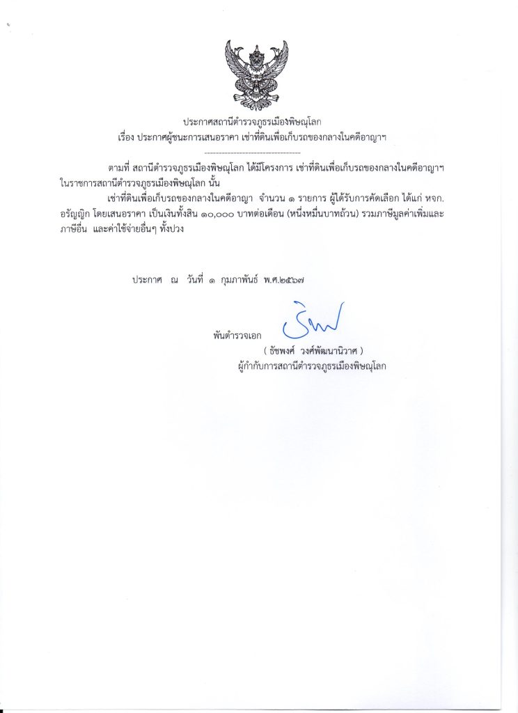 ประกาศจัดซื้อจัดจ้าง เช่าที่ดินเพื่อเก็บรถของกลางในคดีอาญาฯ