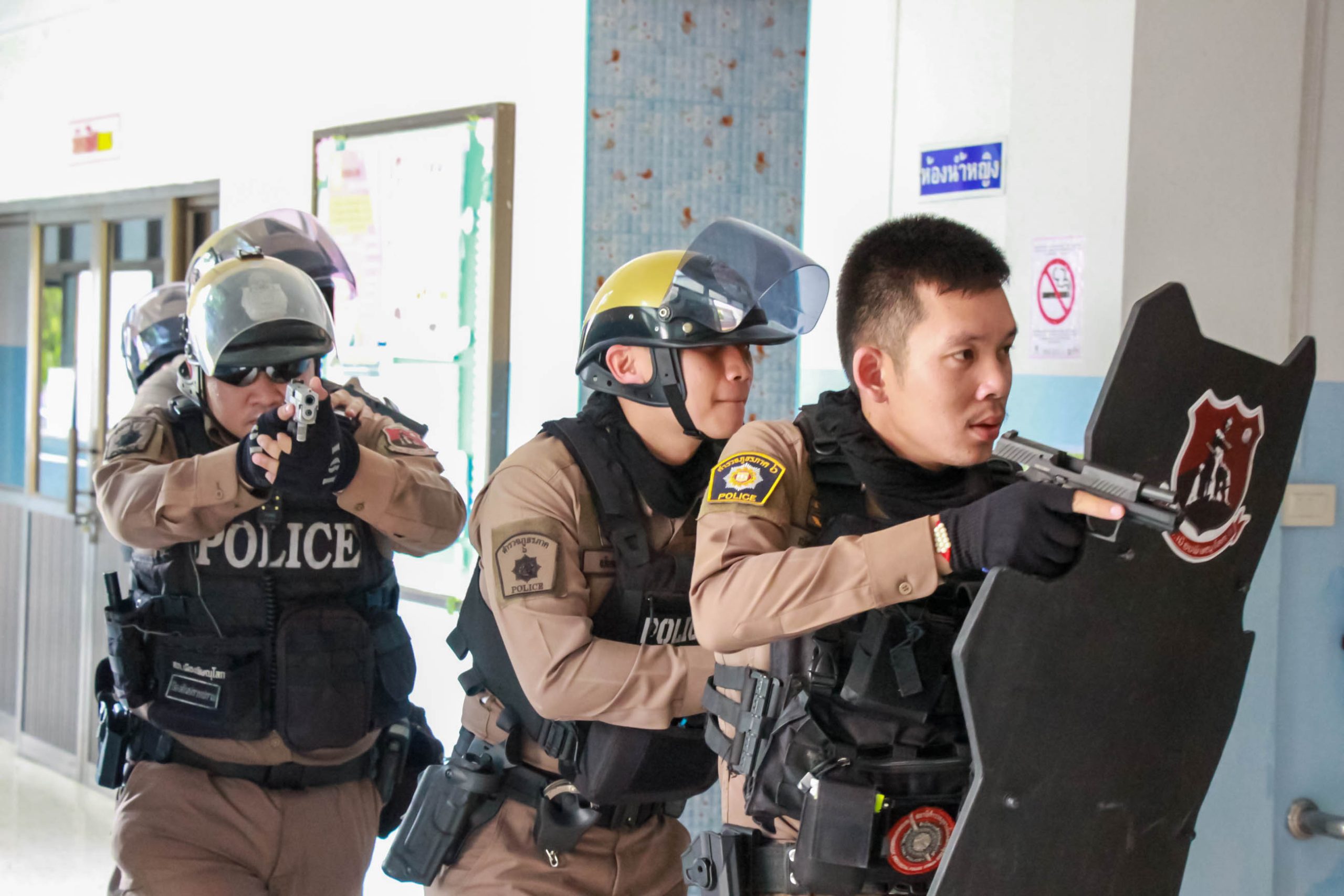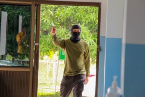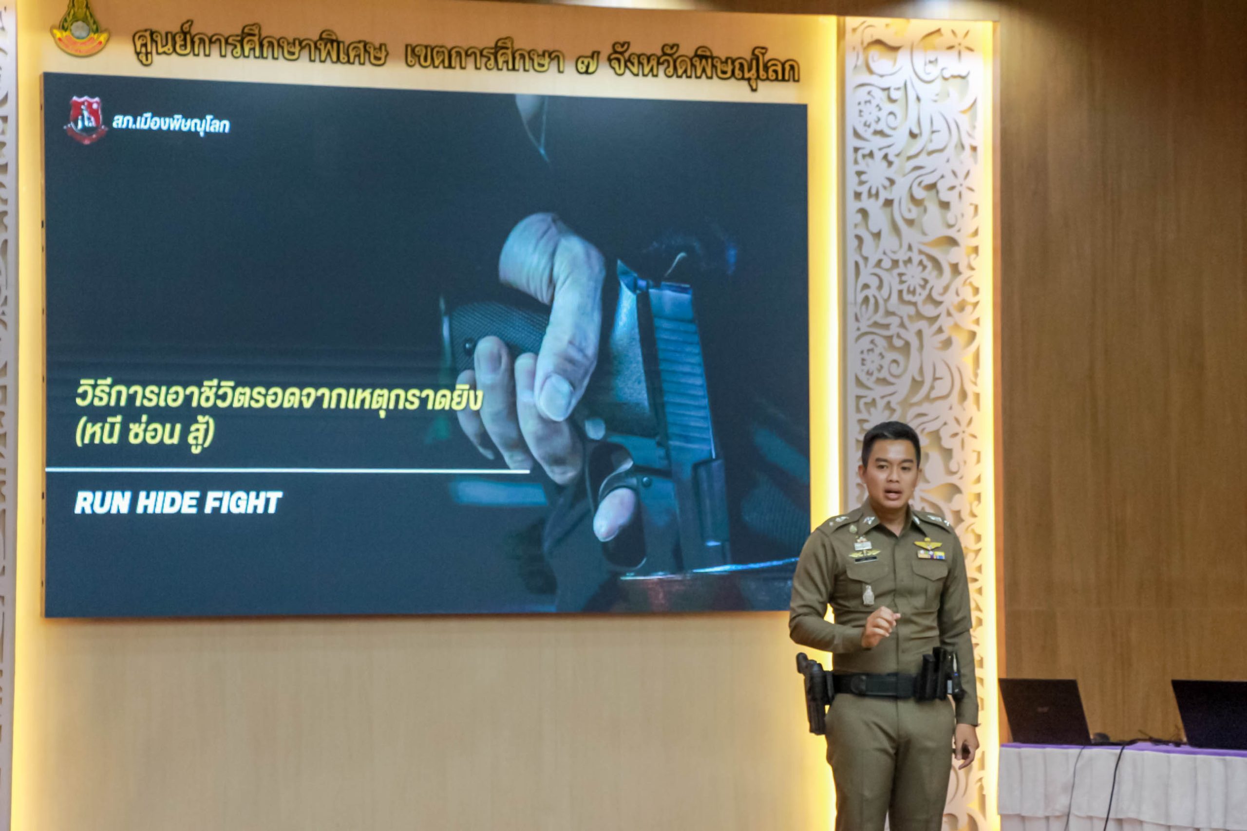 การซักซ้อมแผนเผชิญเหตุ กรณีบุคคลภายนอกเข้ามาก่อเหตุ ความไม่ปลอดภัยในสถานศึกษา “หนี ซ่อน สู้” (Run Hide Fight) และวิธีการใช้ไม้ง่ามระงับเหตุ