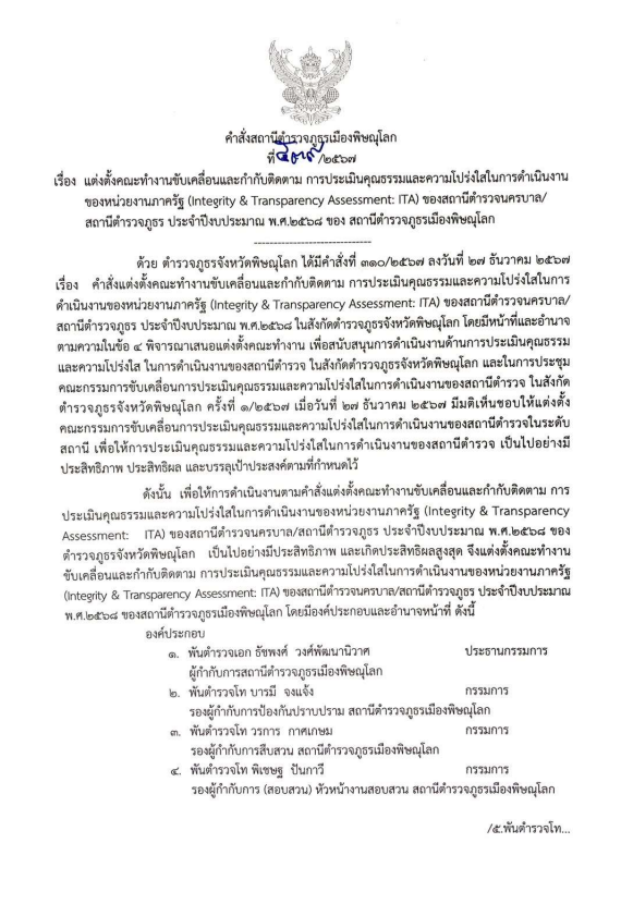 (คลิ๊กเพื่ออ่าน)คำสั่ง สถานีตำรวจภูธรเมืองพิษณุโลก ที่ 539/2567 ลง 27 ธ.ค.2567 เรื่อง แต่งตั้งคณะทำงานขับเคลื่อนและกำกับติดตาม การประเมินคุณธรรมและความโปร่งใสในการดำเนินงานของหน่วยงานภาครัฐฯ ITA 2568