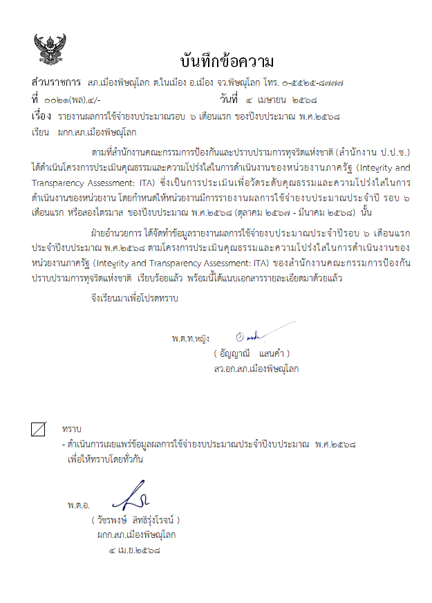 รายงานการใช้จ่ายงบประมาณ สถานีตำรวจภูธรเมืองพิษณุโลก